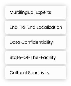 Our multilingual talent force is our X-factor. They bring a wealth of experience and expertise in detecting cultural sensitivities, linguistic nuances, and technical hiccups to zero down on formulating project-specific localization solutions. Every service is tailored by the people for the people, fostering heart-to-heart connections as human emotions are woven into the tapestry.